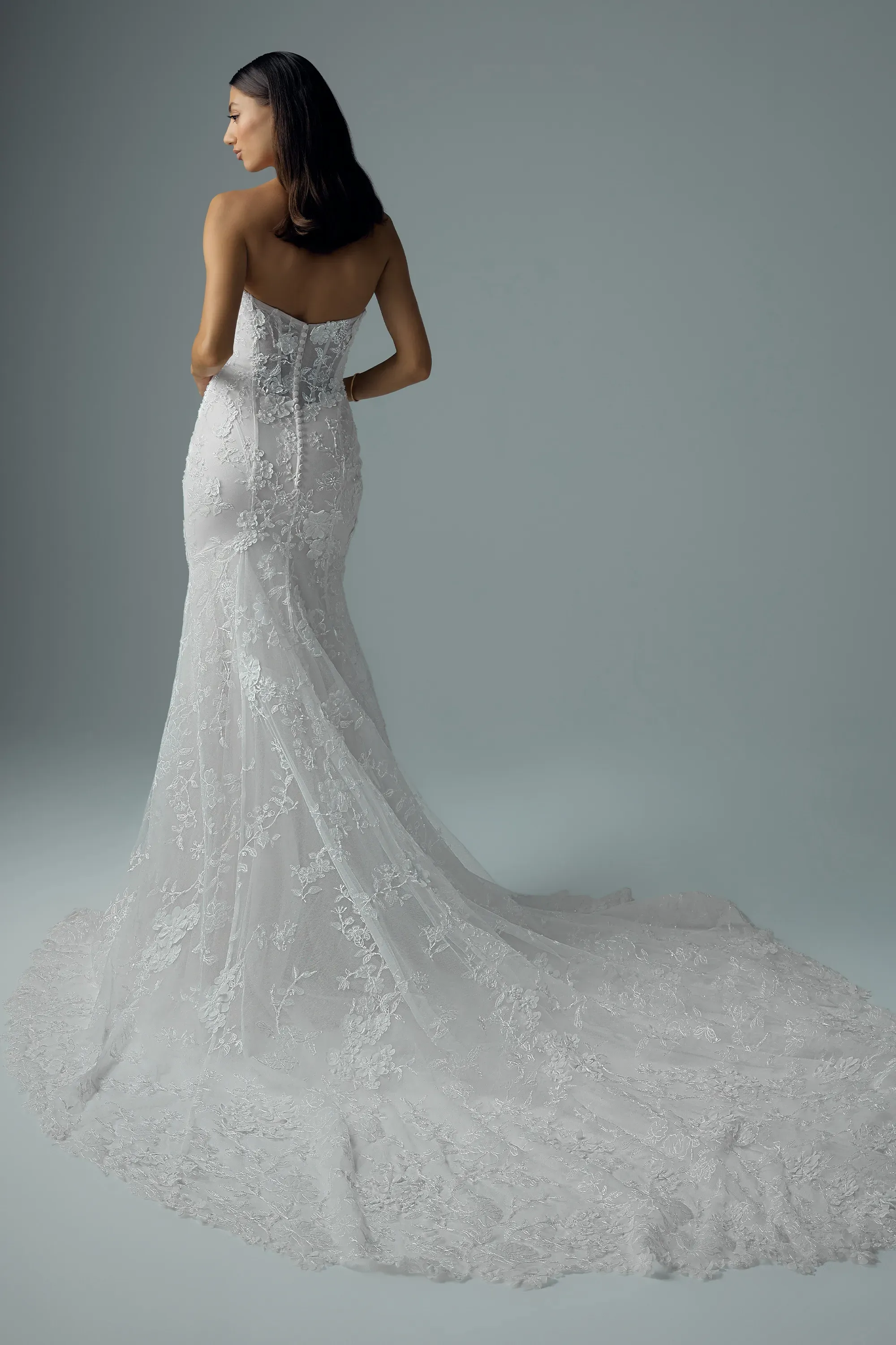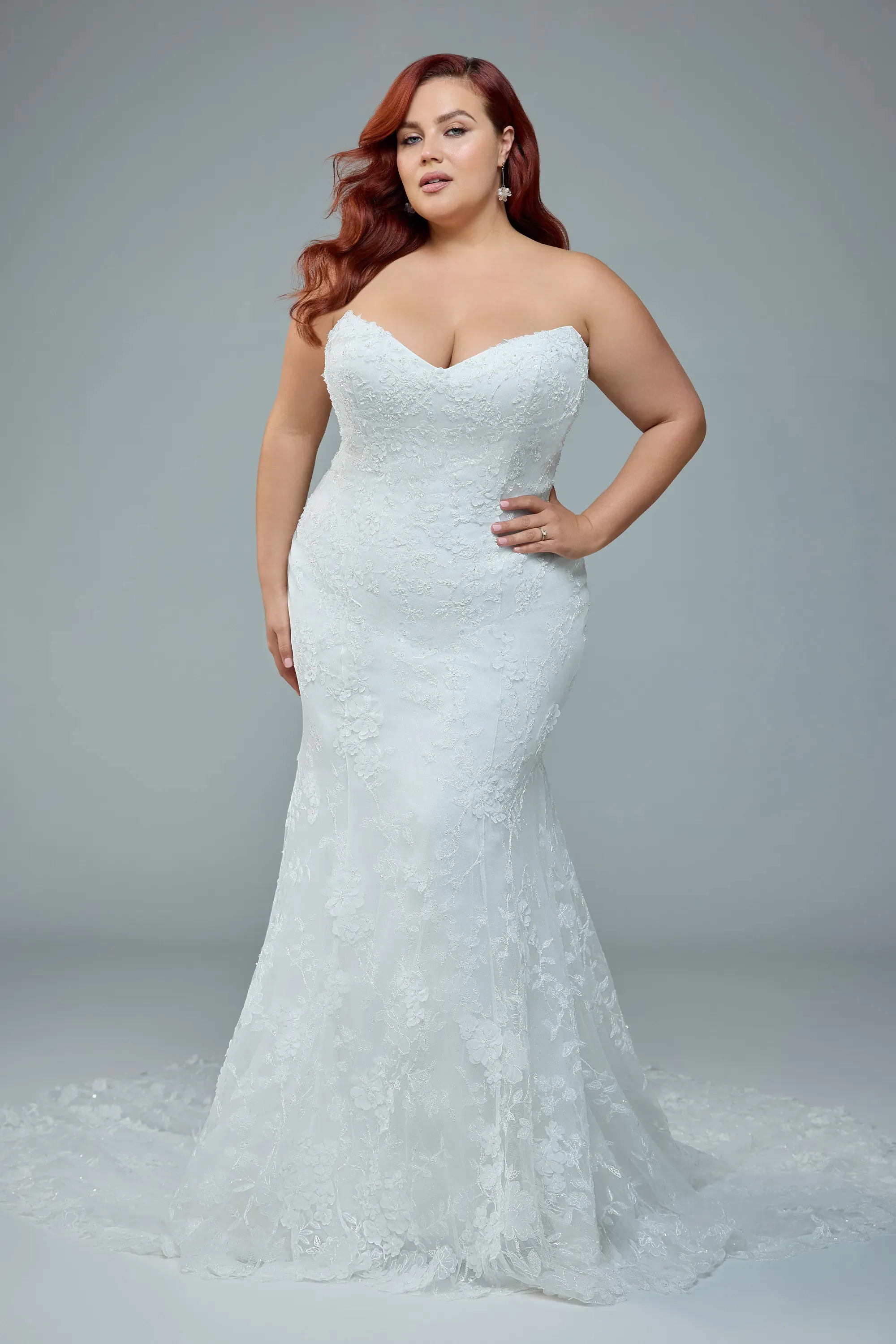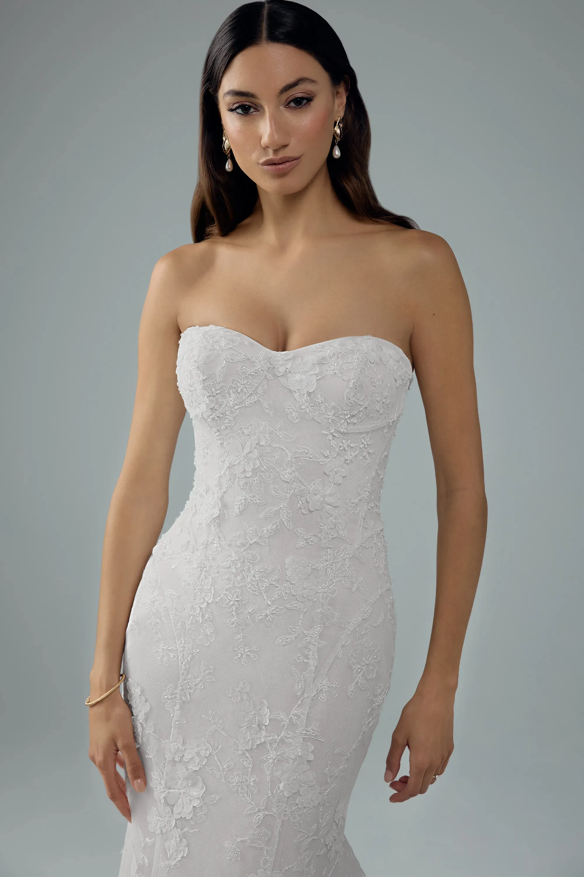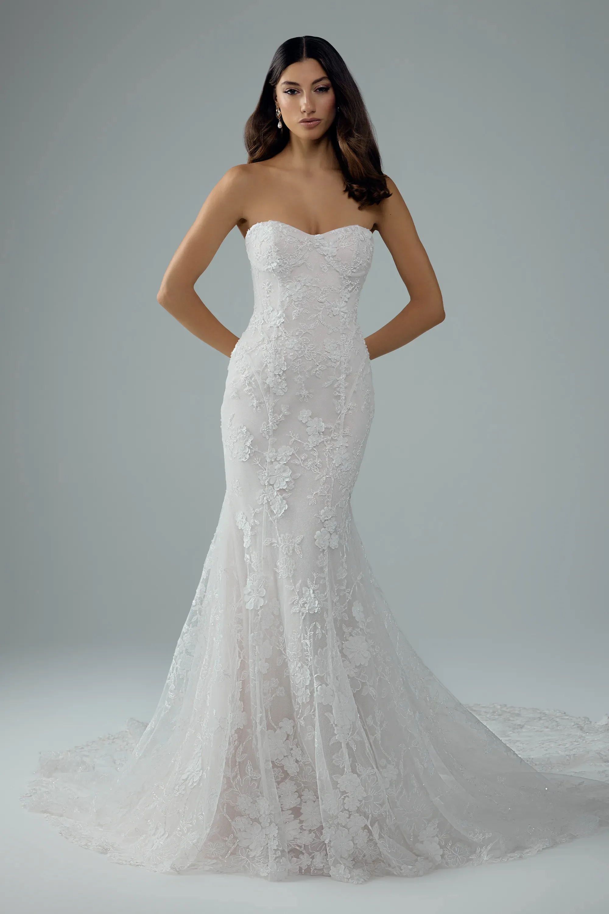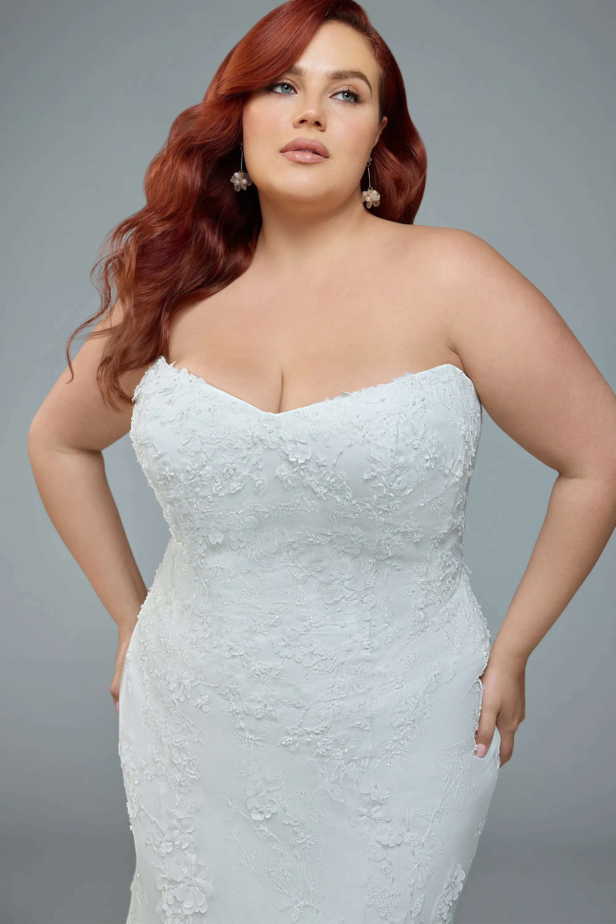 Cosette captivates with her delicate balance of flirtation and refined beauty. Cosette's strapless sweetheart bodice is crafted from shimmering floral overlace decorated with beads and 3D flowers, and layered over glitter tulle, creating subtle sparkle with every sudden movement. A sheer back adds a touch of intrigue, while fabric-covered buttons conceal a practical zipper-back. The fit-and-flare skirt gracefully follows the bodice’s delicate lace and beadwork, skimming the silhouette to enhance every curve with effortless elegance. Turn heads in the glamorous Cosette!