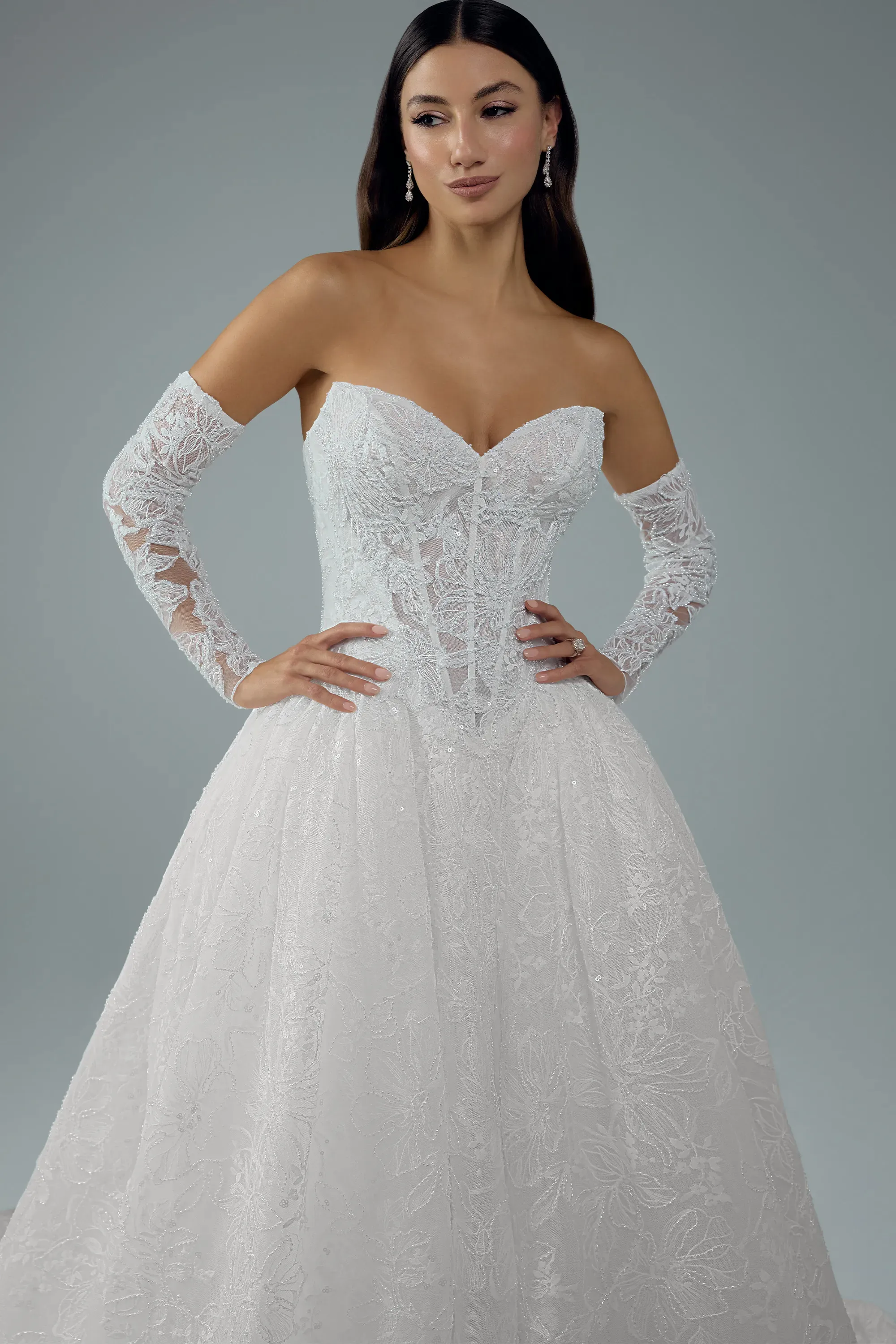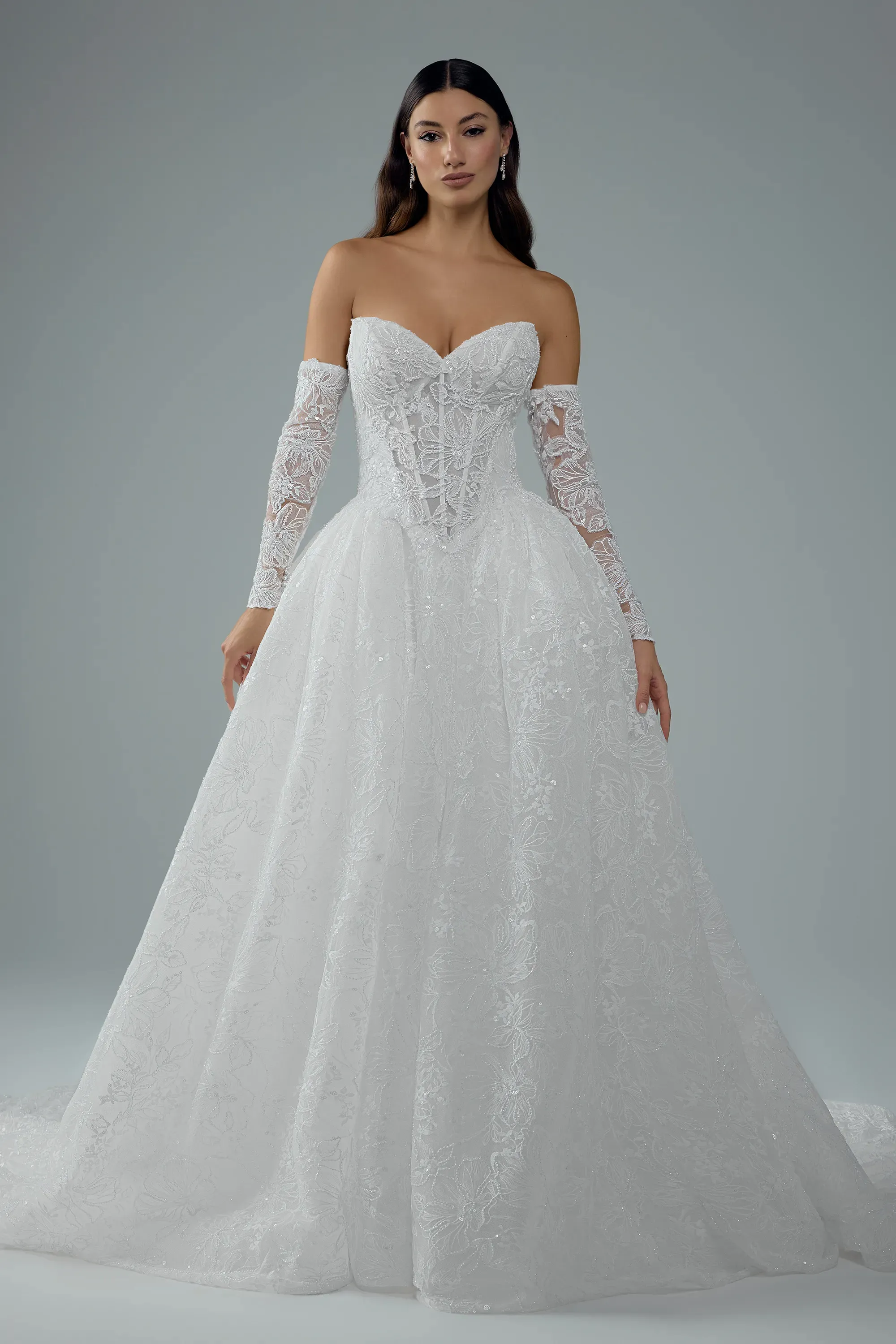 Hibiscus is made for the bride who dreams of a gown that feels powerful, romantic, and unforgettable. Her strapless V-neck bodice is crafted from delicately beaded floral overlace that glistens softly in the light. Her sheer bodice features visible boning and a flattering basque waist, shaping the figure with elegant structure while adding a hint of allure. Optional detachable gauntlet sleeves offer a poetic, vintage-inspired touch. Her full ballgown skirt is crafted from a layer of misty tulle and beaded overlace, moving beautifully as you walk.