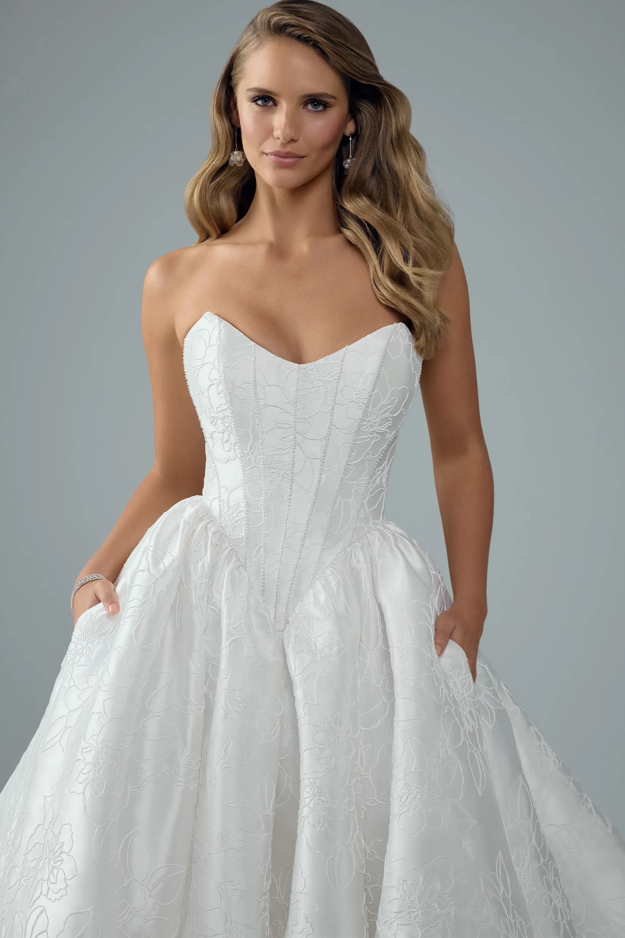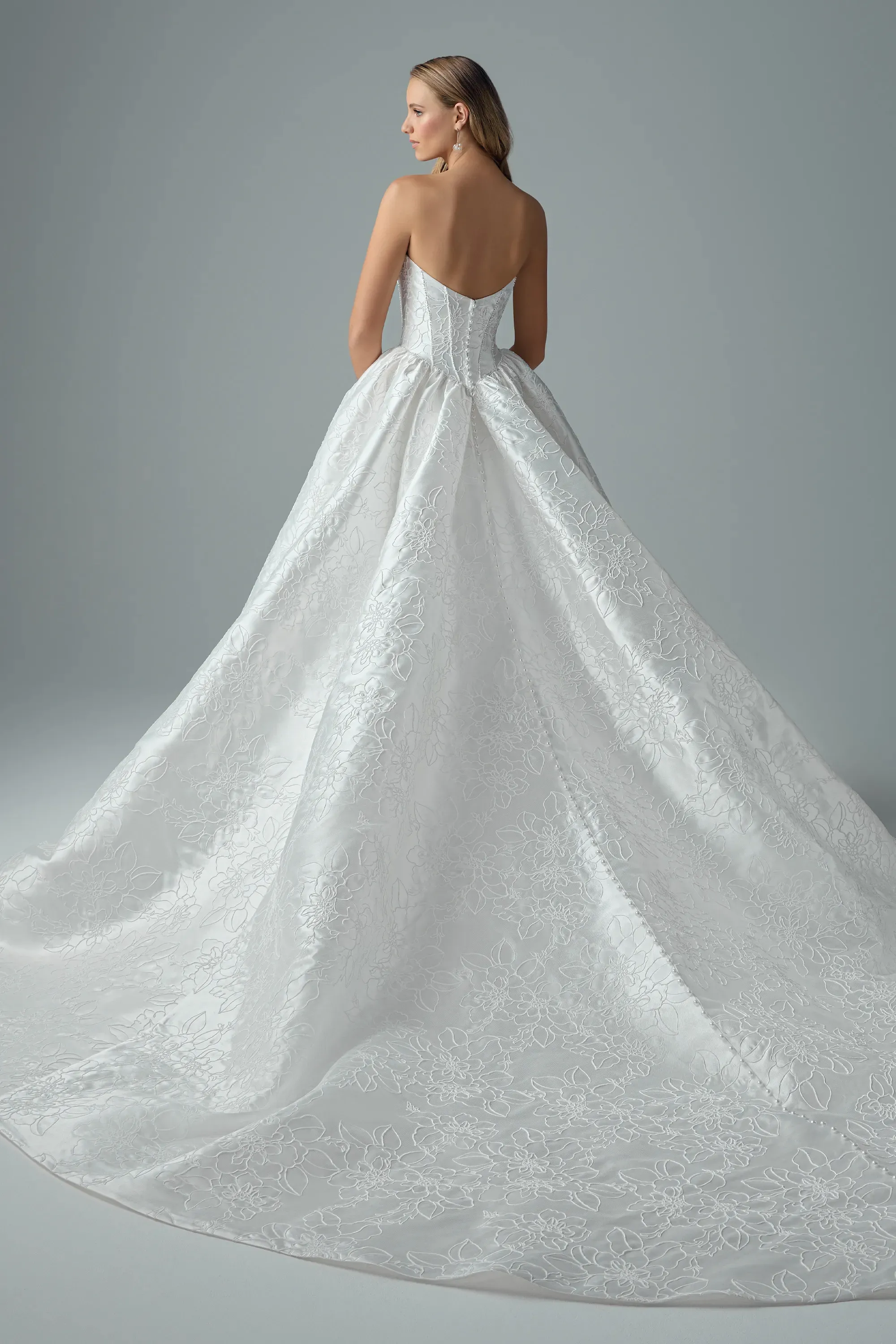 Our Rosalie wedding gown is elegance at its finest. Crafted from luxe mikado with captivating corded overlace, her strapless scoop bodice features carefully placed boning, each line traced with dainty pearls that follow through to outline the curve of her basque waistline. The back bodice adds to her elegance with a zipper back concealed by dainty pearl buttons that trail seamlessly down the chapel-length train. Her full skirt floats with quiet drama, holding its shape effortlessly while moving with softness and depth. Can you imagine yourself making your dramatic entrance in this luxuriously regal wedding dress?