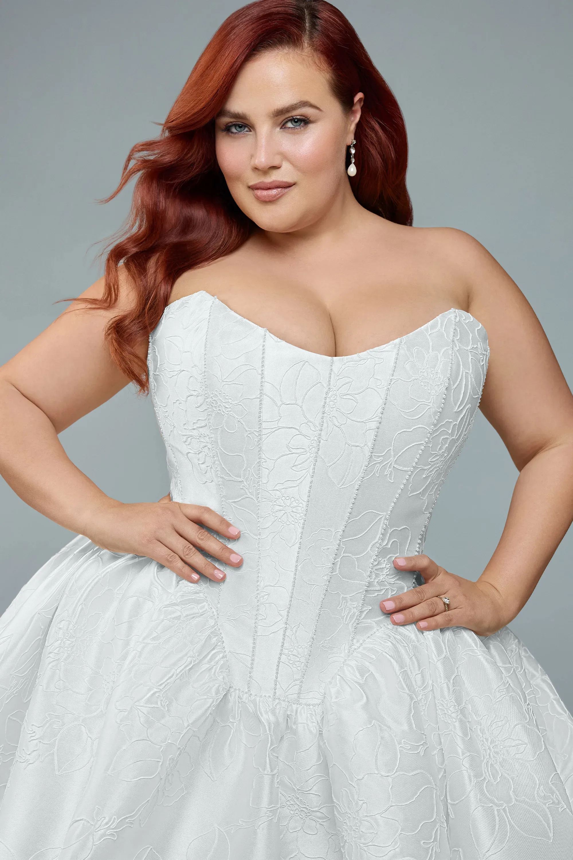 If a lace-up back is your go-to for that cinched, sculpted fit, Rosalie is available as Style ST673LB. For a look that truly commands the room, complete Rosalie with her matching two-tiered pearl veil with a beaded trim, available as Style ST673VEIL.