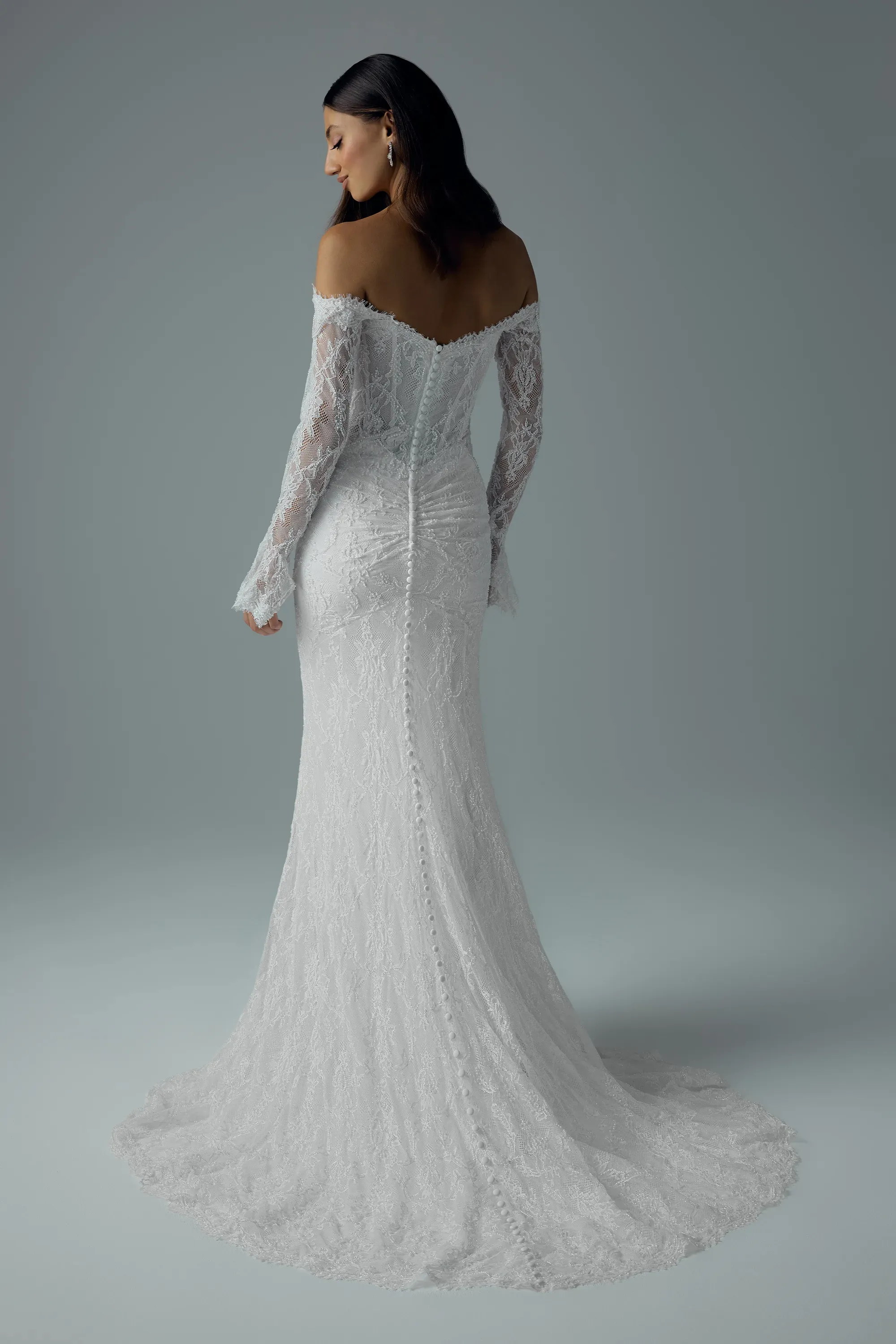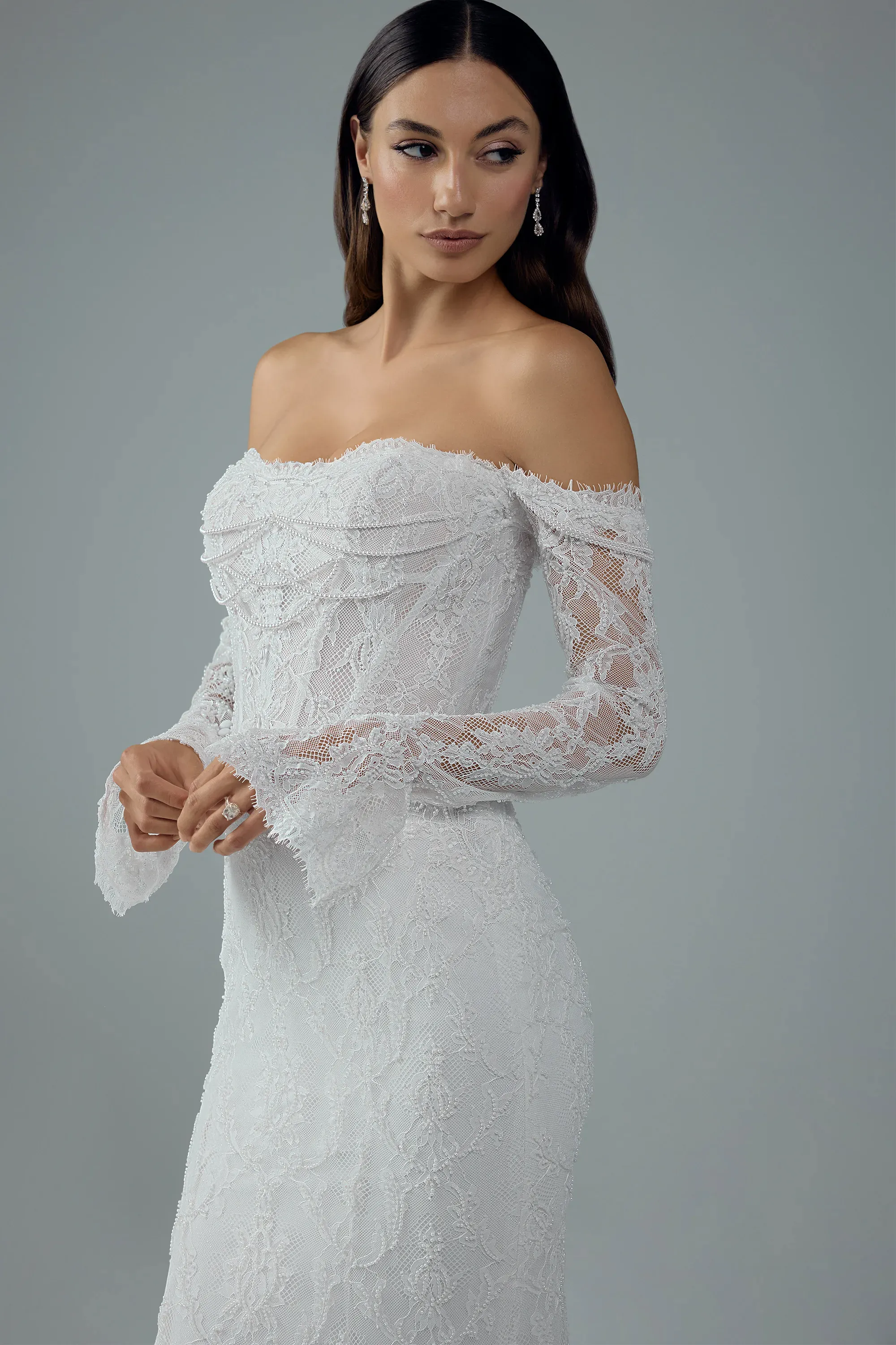 Constance will bring your dreams of a royal wedding to life! Crafted from beaded overlace, her sheer bodice features visible boning and carefully draped pearls that contour the body and add a bold, modern finish. The sweetheart neckline is paired with detachable off shoulder sleeves, detailed with pearl strands that drape elegantly across the upper arm for just the right touch of drama. Her subtle fit-and-flare silhouette hugs in all the right places before flowing into a soft sweep train - effortless to move in, unforgettable to wear. Can you see yourself twirling into happily ever after in this sexy wedding dress with draped pearls?